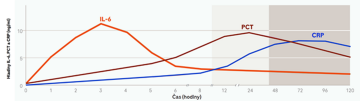 CRP je tradiční, robustní, ale méně specifický marker zánětu. Jeho interpretace by měla probíhat primárně v kontextu s ostatními biomarkery a se znalostí jeho kinetiky, protože jeho hladiny mají výrazně pomalejší dynamiku ve srovnání s PCT nebo IL-6 (viz Obr. 1).12