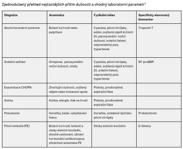Ačkoli dušnost má nejčastěji plicní nebo kardiální etiologii, existuje řada dalších příčin, které je třeba mít na paměti – například anémie, metabolické poruchy či stavy psychogenního původu.3 Důležité je rovněž uvědomit si možnost překrývání několika patologických stavů, zejména u polymorbidních pacientů s již přítomným chronickým srdečním onemocněním.4 V takových případech není jednoduché jednotlivé příčiny dušnosti odlišit. Z tohoto důvodu je nezbytné laboratorní vyšetření indikovat cíleně (zjednodušený přehled viz tabulka níže) a výsledky laboratorních vyšetření interpretovat v kontextu celkového klinického stavu pacienta.4
